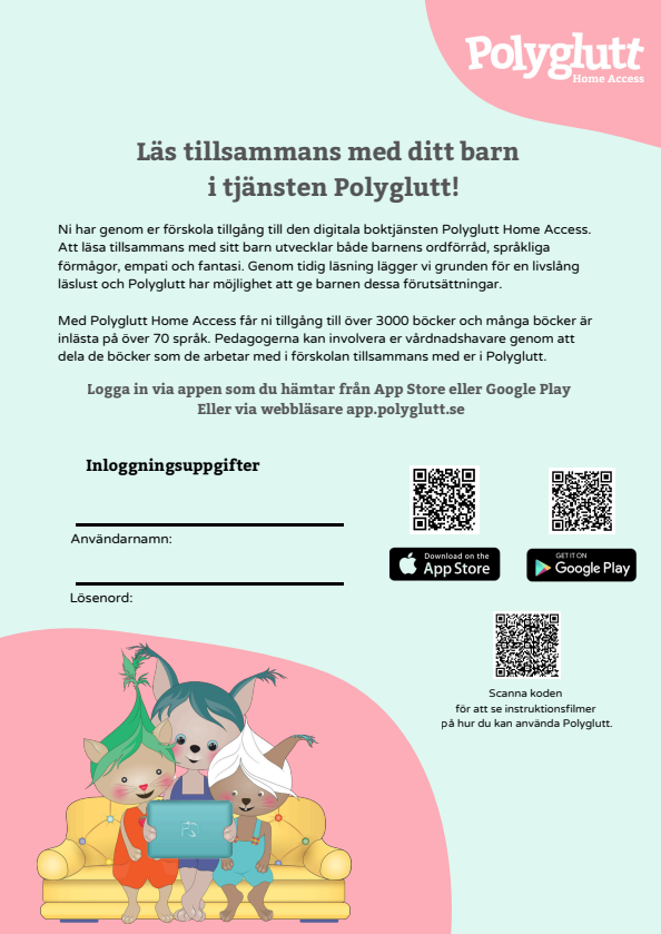 Ladda ner och skriv ut affischen för Polyglutt Home Access där du kan fylla i användarnamn och lösenord till förskolans vårdnadshavare.