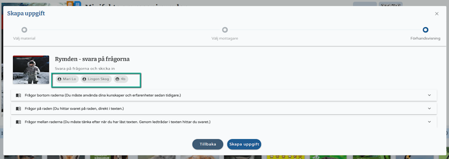 I steg tre ser du vilka elever som du delar uppgifterna med. Välj därefter Skapa uppgift.