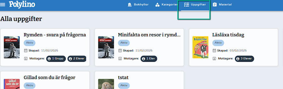 I Polylino hittar du böcker med frågor, och du har möjlighet att skapa uppgifter att dela till dina elever.