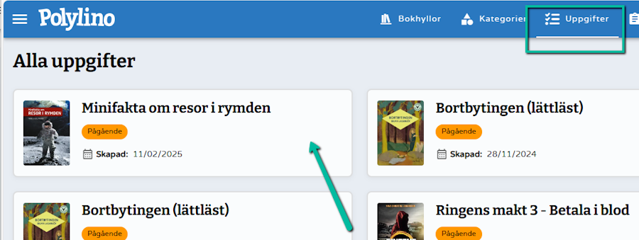 När eleven loggar in på sitt konto via appen Polylino eller via vår hemsida ilteducation.com eller direktadressen app.polylino.se, hittar de uppgifterna genom att i menyn välja Uppgifter. Eleven klickar här på den vita rutan för att öppna upp informationen samt uppgifterna.