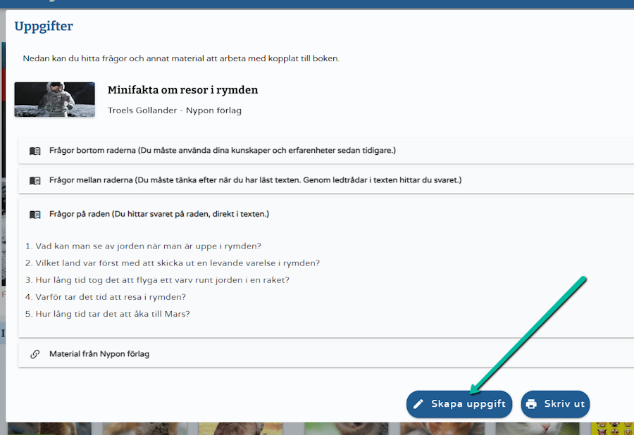 Här ser du samtliga frågor till boken. För att dela uppgifter till eleven/eleverna väljer du Skapa uppgift.