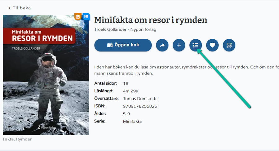 Du kan såklart också söka fram en bok på tex titel eller författare. Om boken har frågor är bokens framsida markerad med en symbol för Läsförståelsefrågor.