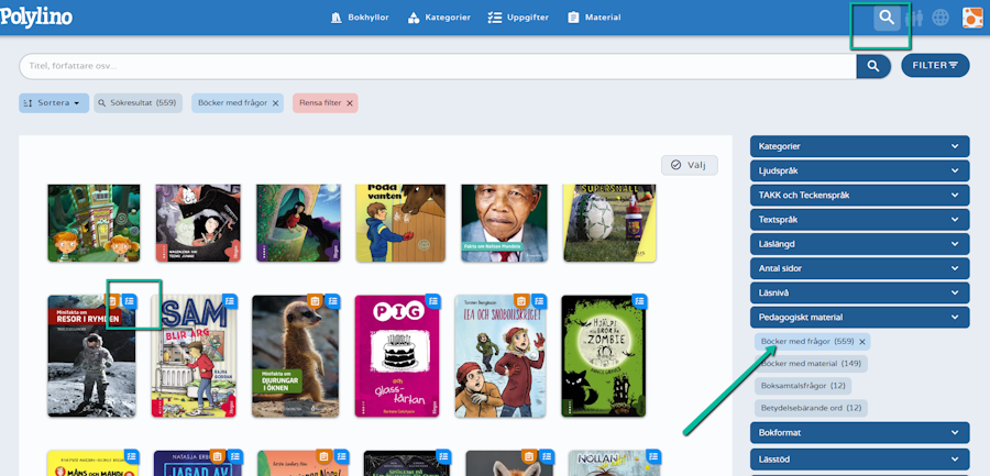 Genom att filtrera via förstoringsglaset uppe till höger i Polylino och välja Pedagogiskt material, hittar du Böcker med frågor.