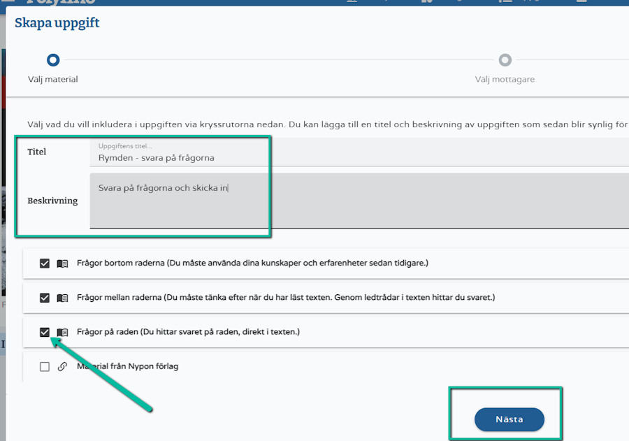 Du har möjlighet att sätta en titel samt beskriva uppgiften för eleven/eleverna. Markera därefter i rutan de uppgifterna som du önskar dela med eleven/eleverna.