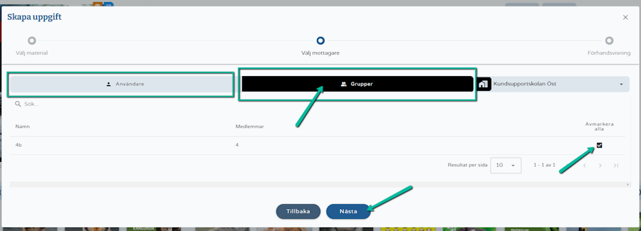 I steg två väljer du den grupp eller den/de elever du vill dela uppgifterna till. Via fliken Användare markerar den eller de elever som uppgifterna ska skickas till.