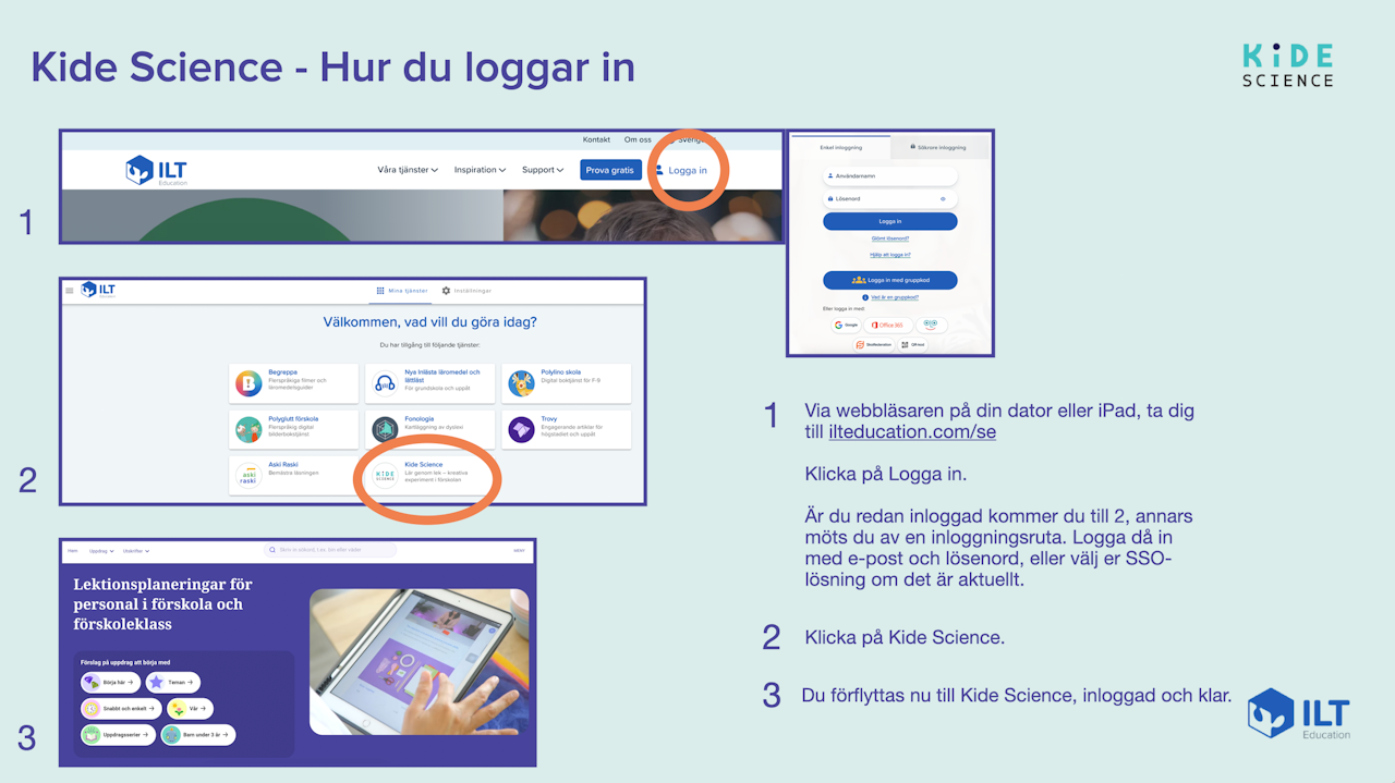 I den här nedladdningsbara guiden visar vi hur du loggar in och även hur du på ett enkelt sätt kan lägga till Kide Science som en genväg på din iPads hemskärm.