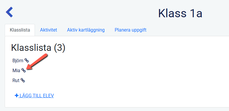 Efter att du kopplat din elev till sitt användarkonto visas en kopplingssymbol efter elevens namn i klasslistan.