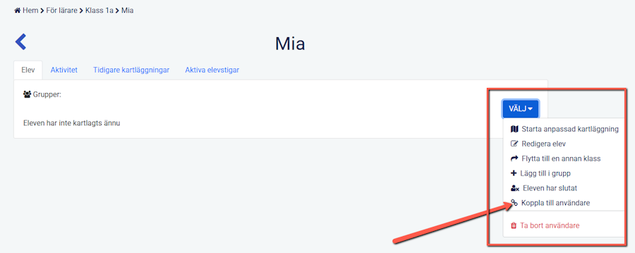 När en elev har loggat in en första gång i Aski Raski kan du koppla eleven till sitt användarkonto. Detta behöver du göra för att möjliggöra delning av uppgifter/stigar med eleven.