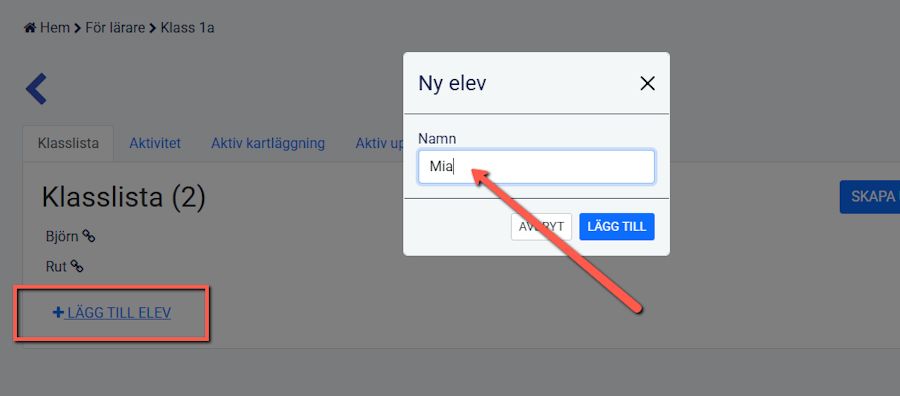 Klicka på Lägg till elev och namnge din elev. Välj Lägg till för att skapa eleven. Fortsätt på samma sätt för att lägga till alla elever som ska ingå i klassen.