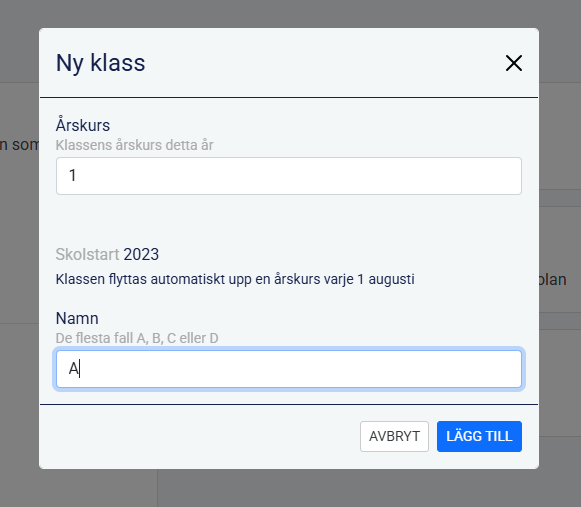 Namnge din klass med årskurs och namn, exempelvis 1A. (Ett klassnamn kan inte innehålla å, ä och ö.) Klicka därefter på Lägg till. Då hamnar du automatiskt i den skapade klassen och du kan nu börja skapa elever.