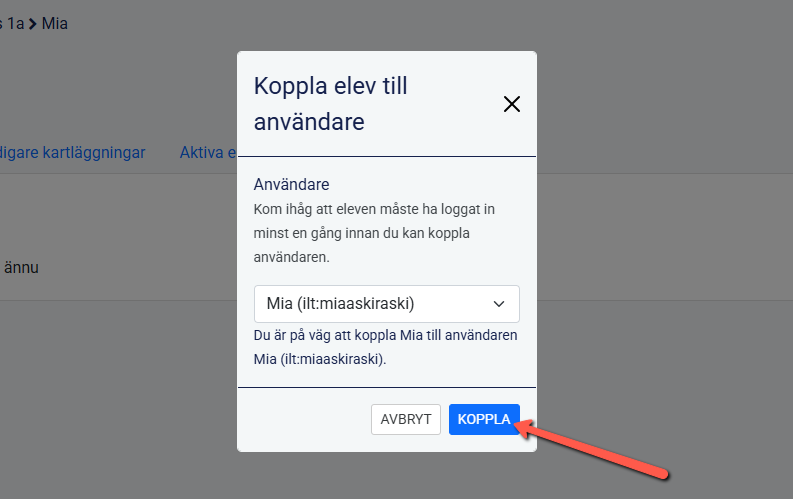 Här kan du nu koppla den elev som du har skapat i Aski Raski. Det du ser i listan är elevens namn och användarnamn som eleven har hos ILT. Välj din elev i listan och klicka därefter på Koppla.
