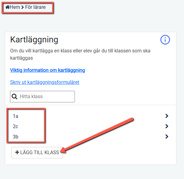 Via För lärare kan du på sidan se samtliga klasser som är upplagda av dig själv och/eller av kollegor. För att skapa en klass klickar du på Lägg till klass.