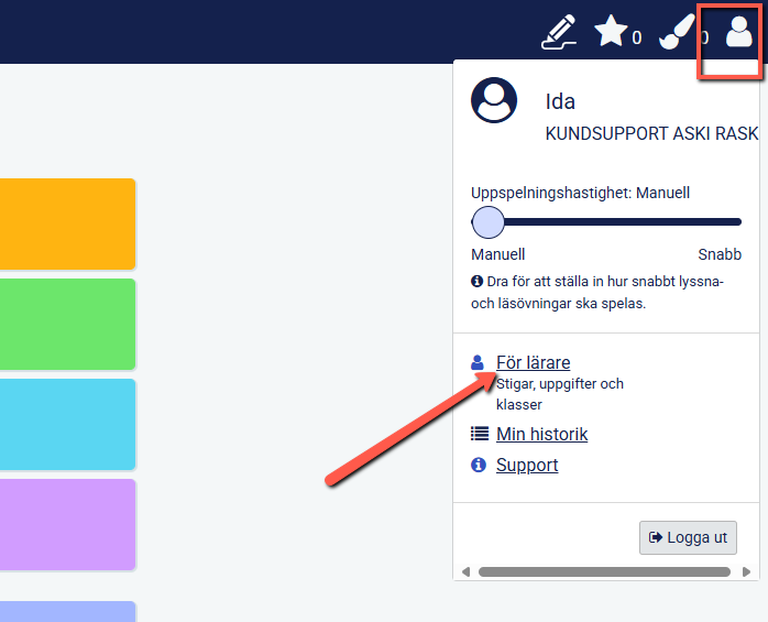Välj att LOGGA IN MED ILT. När du loggat in i Aski Raski väljer du För lärare uppe till höger under din profil.