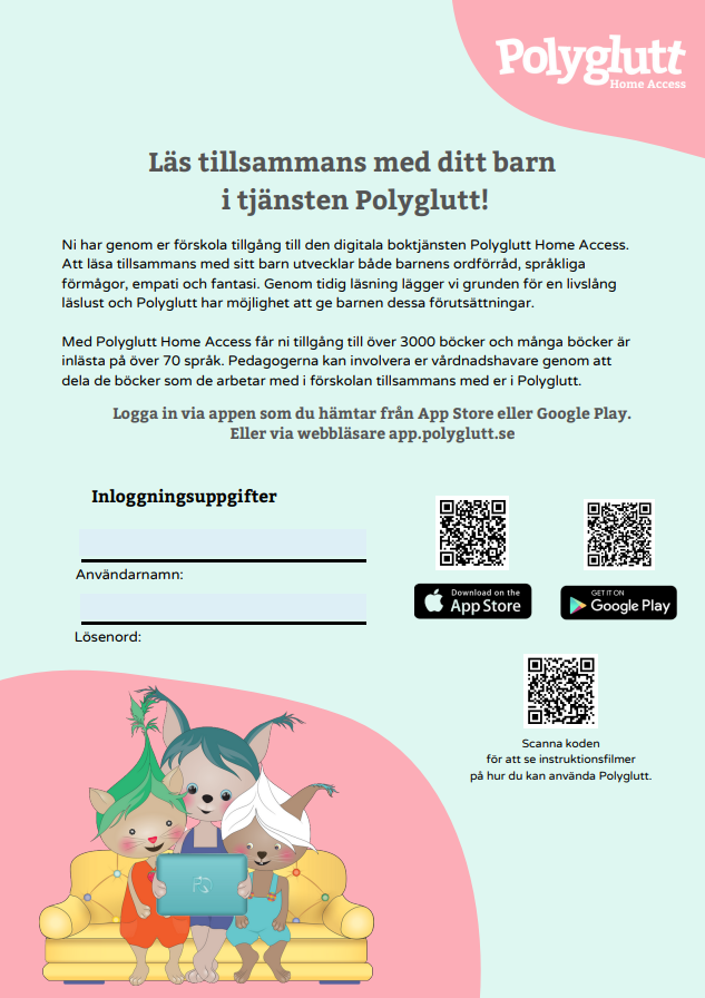 Här kan du ladda ner och skriva ut affischen för Polyglutt Home Access där du kan fylla i användarnamn och lösenord till förskolans vårdnadshavare.