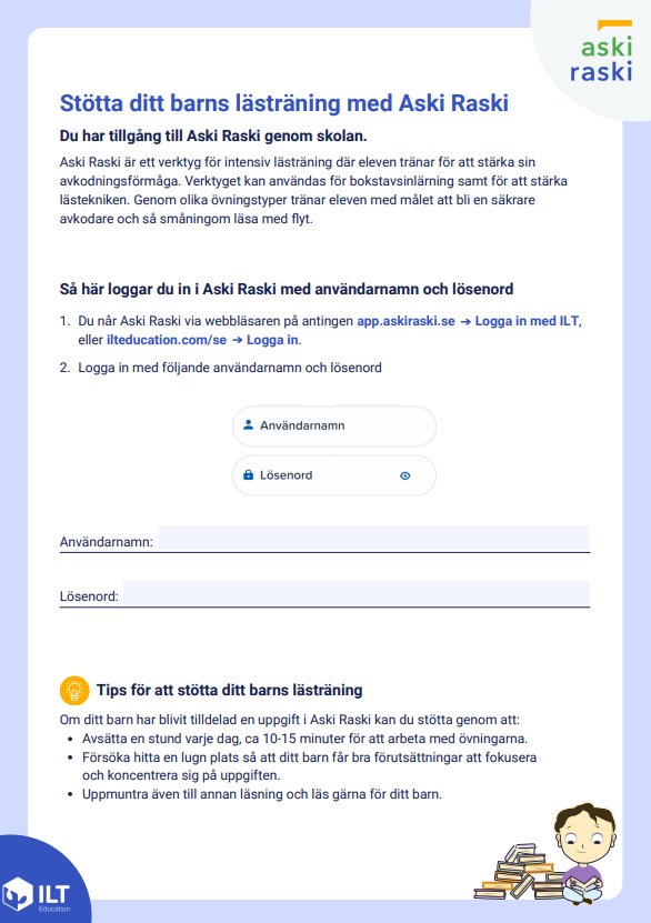 Här hittar du en kort presentation av Aski Raski med möjlighet att fylla i din elevs inloggningsuppgifter.