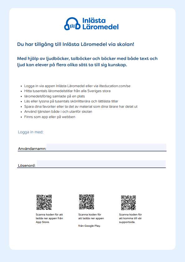 Här hittar du en kort presentation av Inlästa Läromedel med möjlighet att fylla i din elevs inloggningsuppgifter.