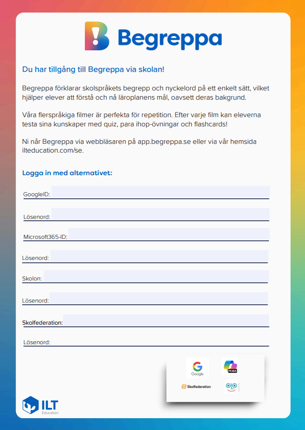 Här hittar du en kort presentation av Begreppa med möjlighet att fylla i din elevs inloggningsuppgifter.