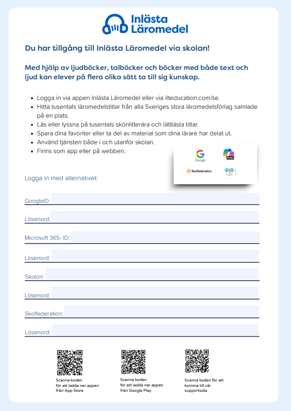 Här hittar du en kort presentation av Inlästa Läromedel med möjlighet att fylla i din elevs inloggningsuppgifter.