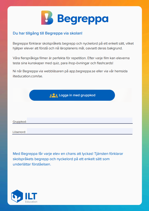 Här hittar du en kort presentation av Begreppa med möjlighet att fylla i din elevs inloggningsuppgifter.