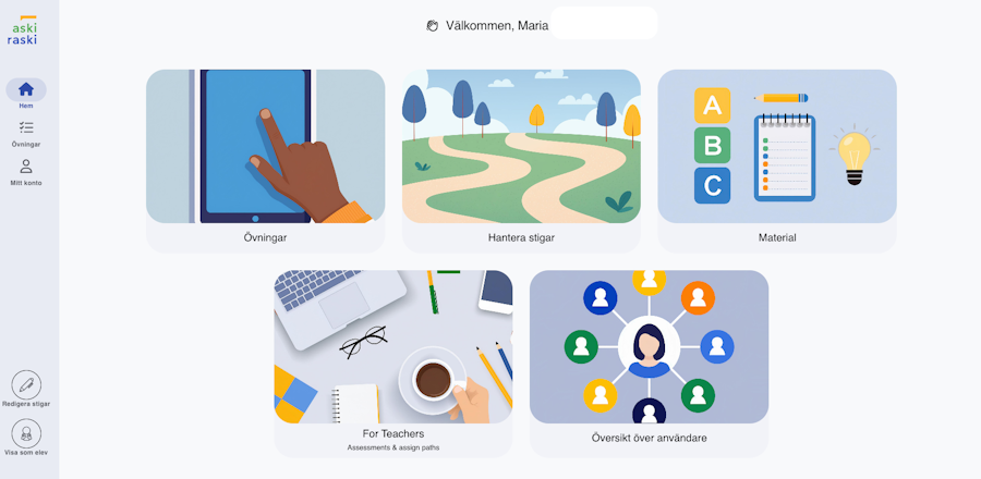Elever och lärare får nu en egen landningssida. För lärare innebär det bland annat genvägar till klasserna, till Material, till grupper och självklart till övningsbanken. Läraren har också hjälpsidor och relevant utbildningsmaterial längst ner.