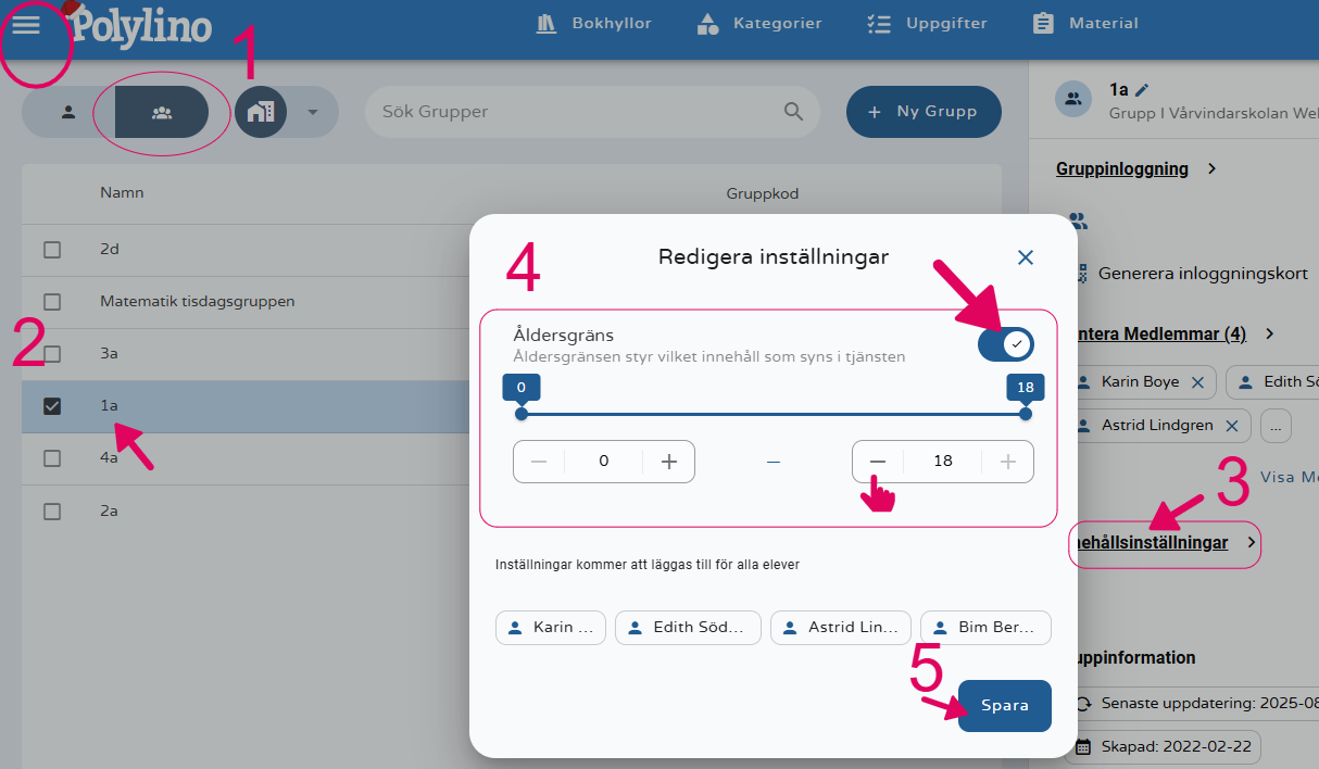 Åldersfiltret sitter alltså inte på själva gruppen, utan tilldelas varje elev i gruppen om du gått den vägen. Genom att söka fram din elev ser du åldersfiltret under Innehållsinställningar.