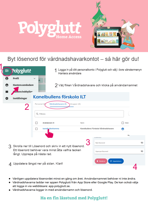 Ta hjälp och skriv ut vår guide för hur ni på förskolan kan byta lösenordet för ert delade vårdnadshavarkonto.