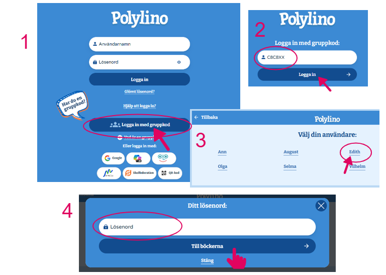 Bild två här intill visar hur eleven loggar in med gruppkod och lösenord.