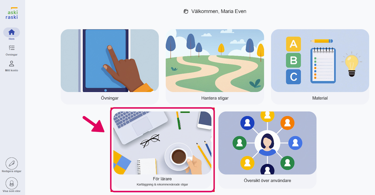 Via För lärare på landningssidan i Aski Raski väljer du den klass där du vill skapa och tilldela uppgifter till en elev eller till hela klassen.