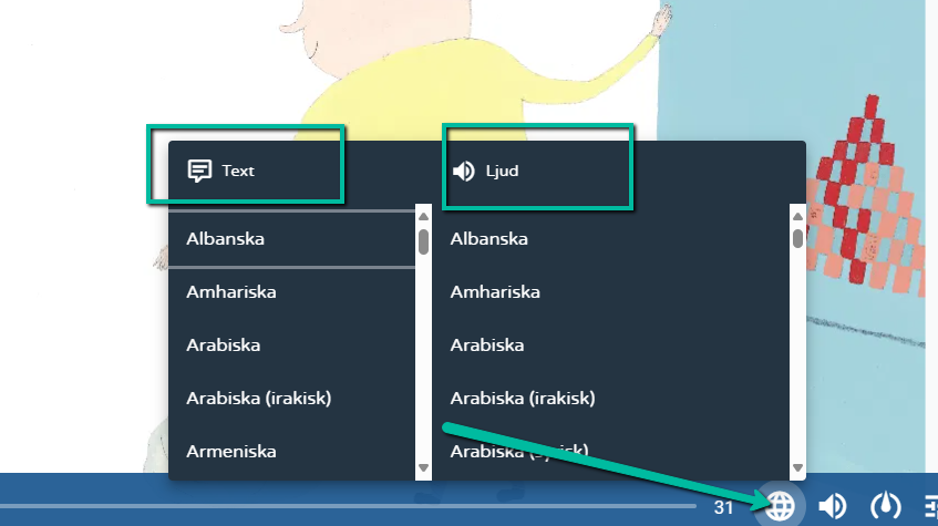När du öppnat en bok kan du via jordgloben nere till höger se vilket språk som är inställt. Här kan du också ändra språk på boken under läsningen som du önskar. Vilka språk för text och ljudspår du kan välja för den enskilda boken visas här.