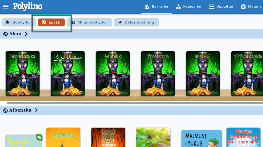 Språkhyllorna i Polylino visar samtliga böcker på de olika språk vi erbjuder i tjänsten. Det kan vara böcker med textspråk eller ljudspår på respektive språk. Du finner språkhyllorna i bokstavsordning och kan skrolla ner för att hitta till rätt språk.